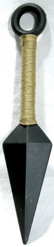 Kunai is one of the most common ninja tools in the Naruto series. It is a black dagger designed for thrusting and stabbing, though it can still do some damage if thrown despite not being designed for it, and is about the length of one's hand.Many shinobi attack by attaching an explosive tag to the blade. The kunai is usually thrown so that it lodges in an object near the target, and then the explosion from the attached tag destroys the target. This use is known as an explosive kunai (?????, kibaku kunai).Kunai can also be kept on spring-loaded wires up the user's sleeve, as seen in Naruto Uzumaki's fight with Sai when they first met. They can be used for close combat, like a normal knife. Empowered with "chakra flow", kunai thrown into targets can cut through solid wood and even solid stone targets.